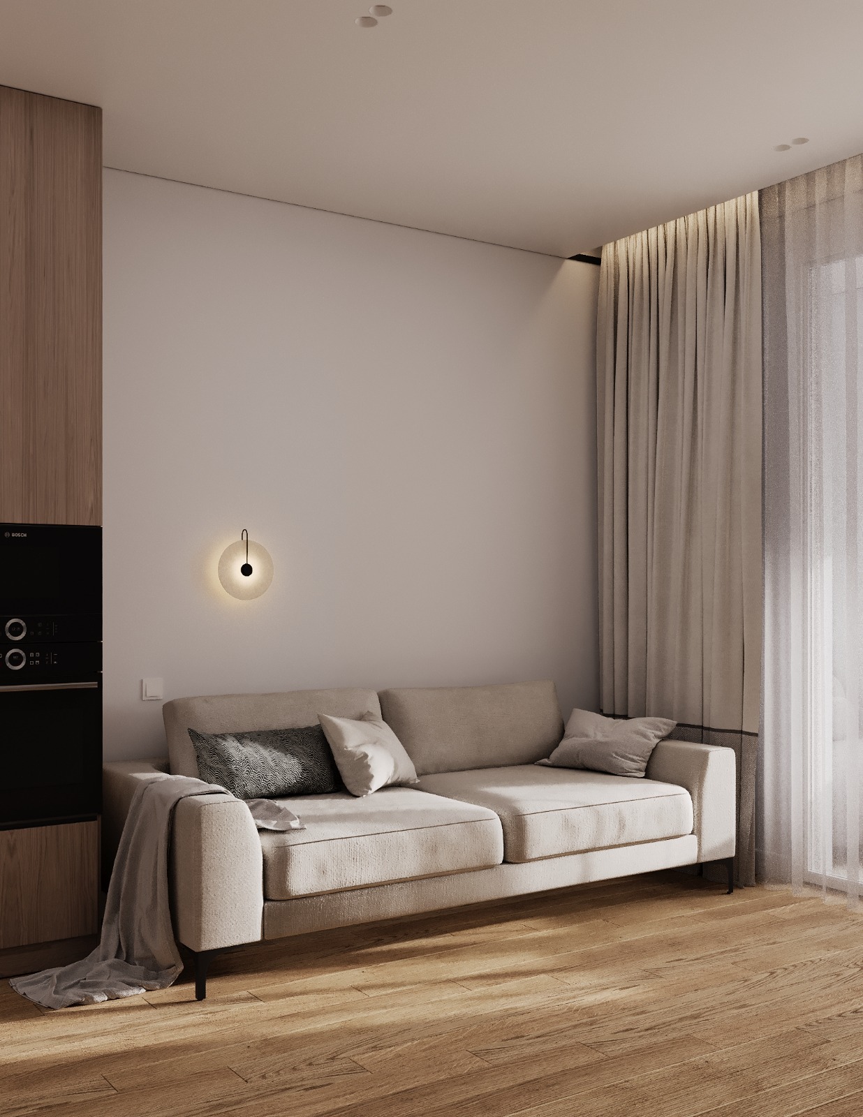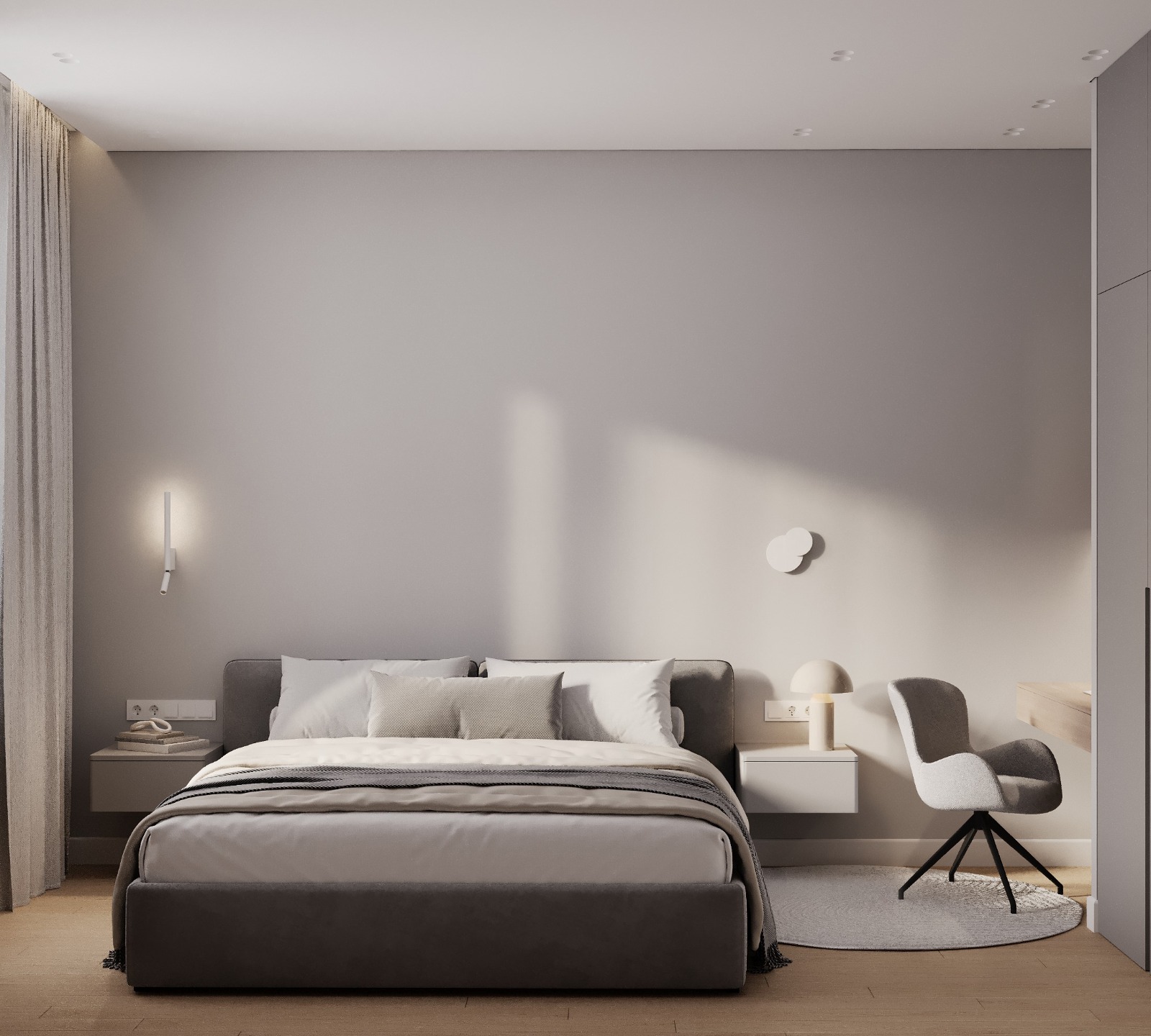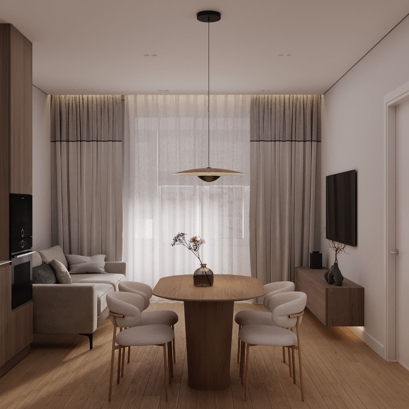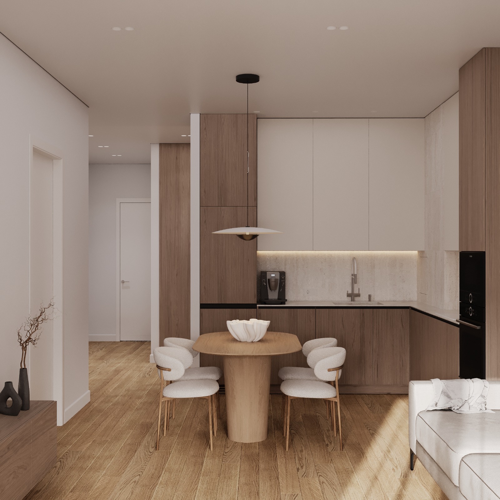 Проект интерьера для семейной пары с дочерью-студенткой выполнен в теплой минималистичной эстетике. Светлая нейтральная палитра, натуральные текстуры и лаконичные формы создают спокойное, гармоничное пространство для жизни и отдыха. В основе функциональность, продуманное зонирование и уют без визуального перегруза.